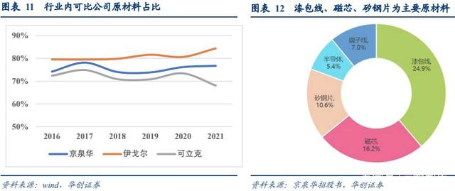 漆包線、磁芯、矽鋼片、半導(dǎo)體等為主要原材料。行業(yè)內(nèi)公司直接材料占比通常在 70%以上,主要原材料為漆包線、磁芯、矽鋼片、半導(dǎo)體等。以京泉華為例,漆包線、磁芯、矽鋼片、半導(dǎo)體分別占 2016 年采購(gòu)金額 24.9%、16.2%、10.6%、5.4%。漆包線主要材料為銅材,矽鋼片以冷軋硅鋼為主要原材料。