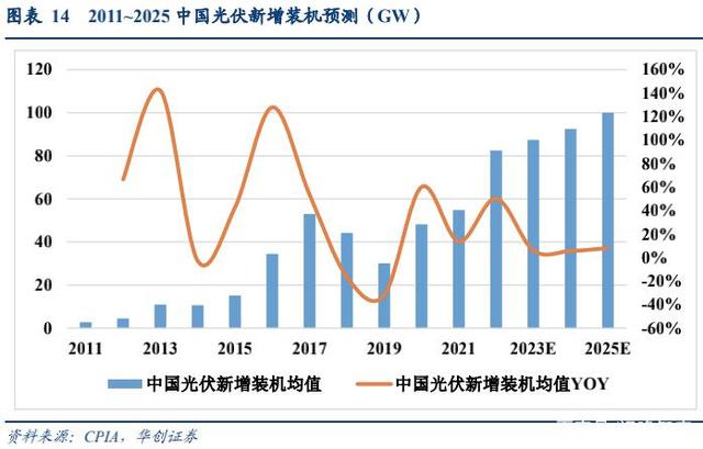 圖表 14 2011~2025 中國(guó)光伏新增裝機(jī)預(yù)測(cè)(GW)
