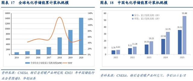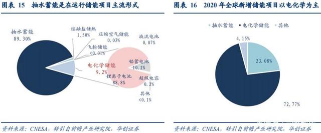 電化學(xué)儲(chǔ)能為新增儲(chǔ)能主流方案。過(guò)去國(guó)內(nèi)外儲(chǔ)能項(xiàng)目以抽水蓄能為主,截至 2020 年抽水蓄能在全球儲(chǔ)能的裝機(jī)占比高達(dá) 89.3%,其次則是電化學(xué)儲(chǔ)能,占比達(dá) 9.2%。而在 2020年新增儲(chǔ)能裝機(jī)中,電化學(xué)儲(chǔ)能裝機(jī)占比卻高達(dá)近 73%,是目前主流的儲(chǔ)能裝機(jī)技術(shù)方案。