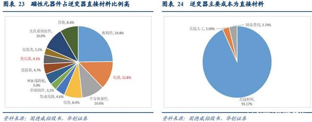 磁性元器件占逆變器成本可達(dá) 15%,儲(chǔ)能逆變器磁性元器件用量更大。逆變器用磁性元器件包括電感、變壓器等,根據(jù)固德威數(shù)據(jù),2019 年逆變器直接材料成本中電感、變壓器分別占比 12.8%和 4.1%,合計(jì)占比 16.9%,僅次于機(jī)構(gòu)件的 24.8%,大于半導(dǎo)體器件10.6%的占比;直接材料占逆變器成本比例 93.17%,由此計(jì)算電感和變壓器占逆變器總成本 15.7%。儲(chǔ)能逆變器增加了 AC/DC 等模塊,磁性元器件用量更大。