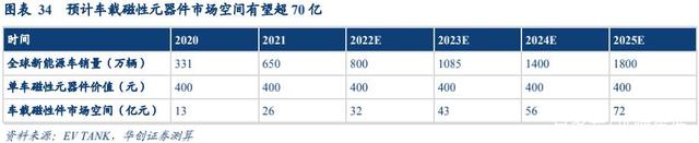 預(yù)計(jì)車(chē)載磁性元器件市場(chǎng)空間 25 年超 70 億。根據(jù) EV TANK 數(shù)據(jù),2025 年全球新能源車(chē)銷量 1800 萬(wàn)輛,十年 CAGR 40.3%;根據(jù)產(chǎn)業(yè)鏈調(diào)研顯示純電動(dòng)車(chē)單車(chē)磁性元器件價(jià)值量在 300~500,取單車(chē)價(jià)值量 400 計(jì)算。根據(jù)我們計(jì)算結(jié)果 21 年車(chē)載磁性元器件市場(chǎng)空間 26 億元,25 年車(chē)載磁性件市場(chǎng)空間有望超 70 億,4 年 CAGR 28.1%。