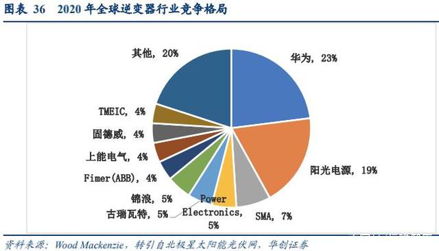 下游逆變器行業(yè)集中度高,國(guó)內(nèi)廠家居前。全球光伏產(chǎn)業(yè)鏈各個(gè)環(huán)節(jié)的主要生產(chǎn)地均在中國(guó)。國(guó)內(nèi)逆變器廠家憑借成本、完善的產(chǎn)業(yè)鏈布局、快速發(fā)展的市場(chǎng)等優(yōu)勢(shì)全球市場(chǎng)份額不斷提升,其中華為、陽(yáng)光電源自 2015 年起穩(wěn)居市場(chǎng)前二,國(guó)內(nèi)其他廠家如錦浪科技、固德威也迎來(lái)快速發(fā)展。根據(jù) Wood Mackenzie 數(shù)據(jù) 2020 行業(yè) CR10 近 80%,前兩名玩家華為、陽(yáng)光電源分別占據(jù) 23%、19%份額,CR2 42%,加上其他國(guó)內(nèi)廠家前十名里國(guó)內(nèi)廠家份額高達(dá) 60%。