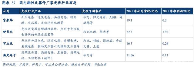 作為逆變器上游的磁性元器件國(guó)內(nèi)廠家同樣處于領(lǐng)先地位,頭部企業(yè)有京泉華、海光電子、可立克、伊戈?duì)枴8鞔判栽骷S家客戶和產(chǎn)品各有側(cè)重,收入規(guī)模皆超 10 億元。