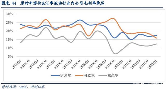 人民幣貶值、大宗企穩(wěn)回落迎拐點(diǎn)。受制于原材料漲價(jià)和匯率波動(dòng),行業(yè)內(nèi)公司盈利水平承壓,2020Q3 起國(guó)內(nèi)代表企業(yè)毛利率下滑。22 年 4 月下旬美元兌人民幣匯率從 6.36快速上行,目前匯率在 6.66 區(qū)間,全年維度看隨著大宗商品價(jià)格企穩(wěn)回落、匯率逐漸修復(fù),行業(yè)內(nèi)公司盈利水平有望逐漸修復(fù),拐點(diǎn)出現(xiàn)。
