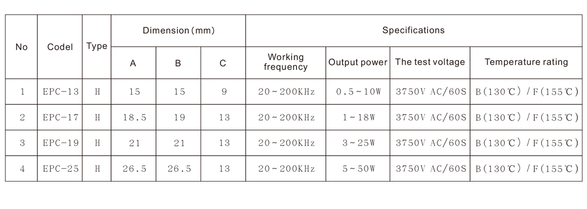 EPC型變壓器是為了適應(yīng)超薄型開關(guān)電源而設(shè)計(jì)的一款高頻變壓器。它擁有扁型的鐵氧體磁芯, 它的形狀能同時(shí)滿足電源變壓器高功率的要求和超薄體積的要求, 同樣也能適應(yīng)開關(guān)電源在溫升方面的要求,但對(duì)PCB板的要求會(huì)提高;它比EFD型變壓器在線包空間上有提高, 同時(shí)EMI性能和漏感、輻射等參數(shù)均優(yōu)于EFD型變壓器, 其它性能接近于EE型和EC型變壓器。EPC變壓器常用型號(hào)有EPC-10,EPC-13,EPC-17,EPC-19,EPC-25,EPC-30等。